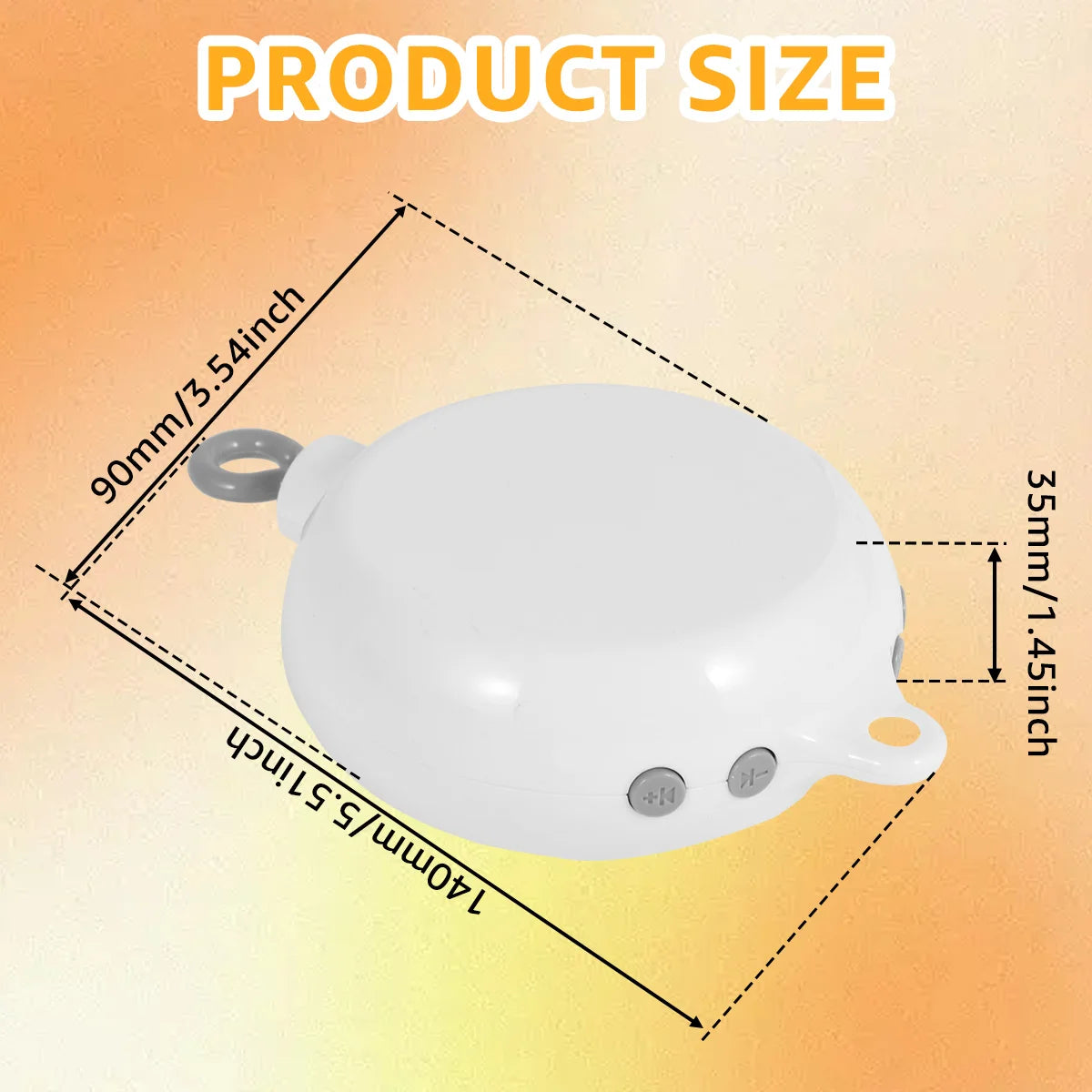 [Baby Mobile Music Box Size] The baby lullaby music box measures approximately 5.51 x 3.54 x 1.38 inches / 14 x 9 x 3.5 cm and fits most cots. NOTE: If the nursery mobile motor will not be used for a long time, please use the button operation of the product to turn it off or remove the batteries to avoid battery leakage and damage to the product.